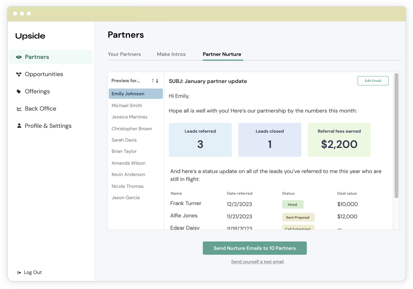 Make it easy for your partners to send you referrals. We help you nurture your partners and stay top of mind with them so that referrals happen frequently.