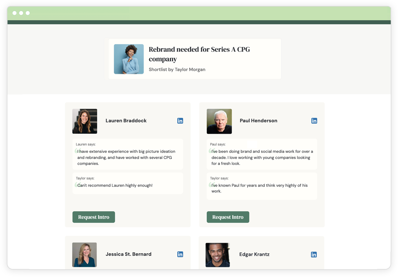 Easily make and track referrals to your partners. Make a 1:1 referral, or curate a group of people in your network who can help. Collect pitches, share a shortlist, and make intros with a single click.