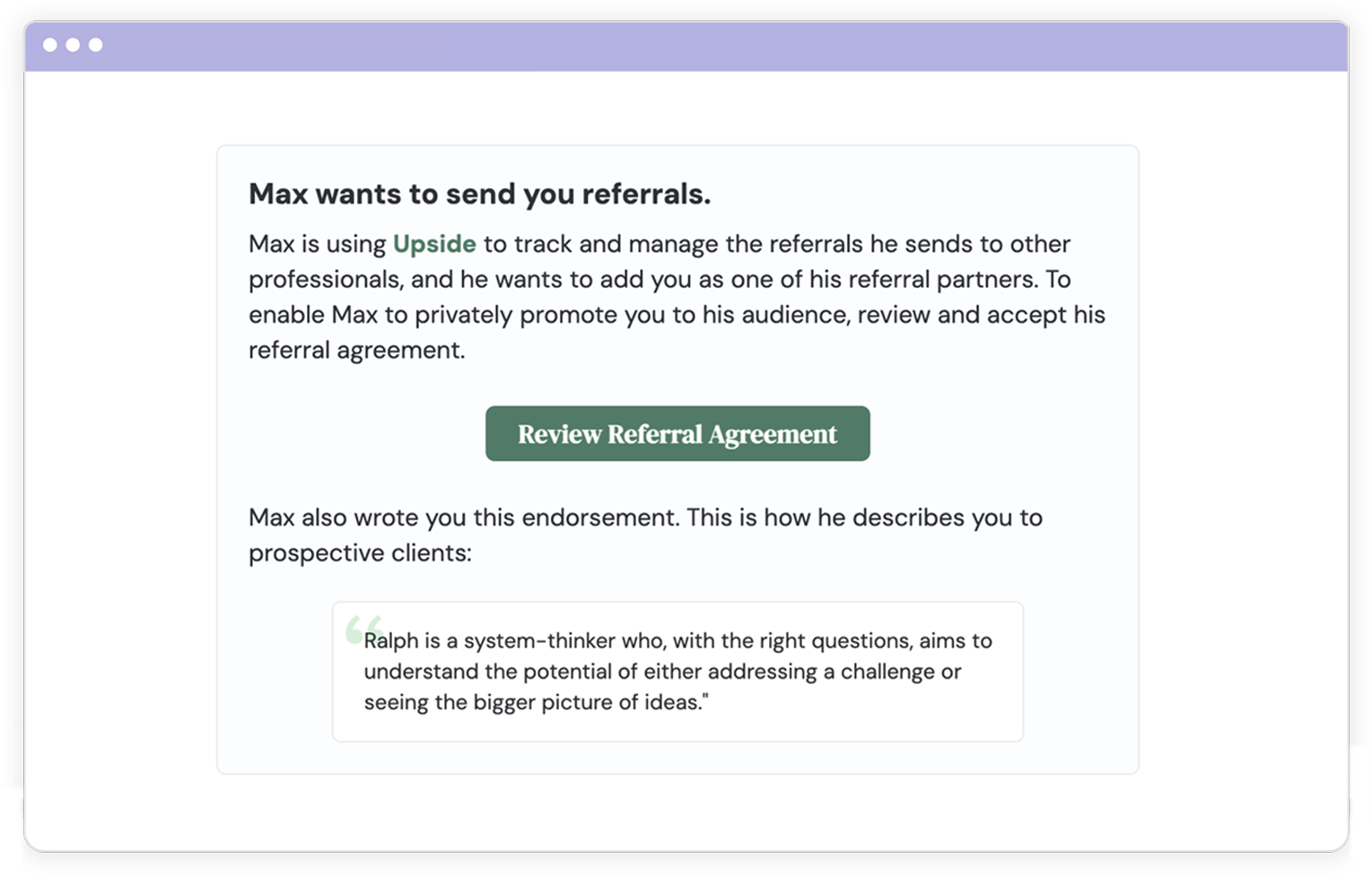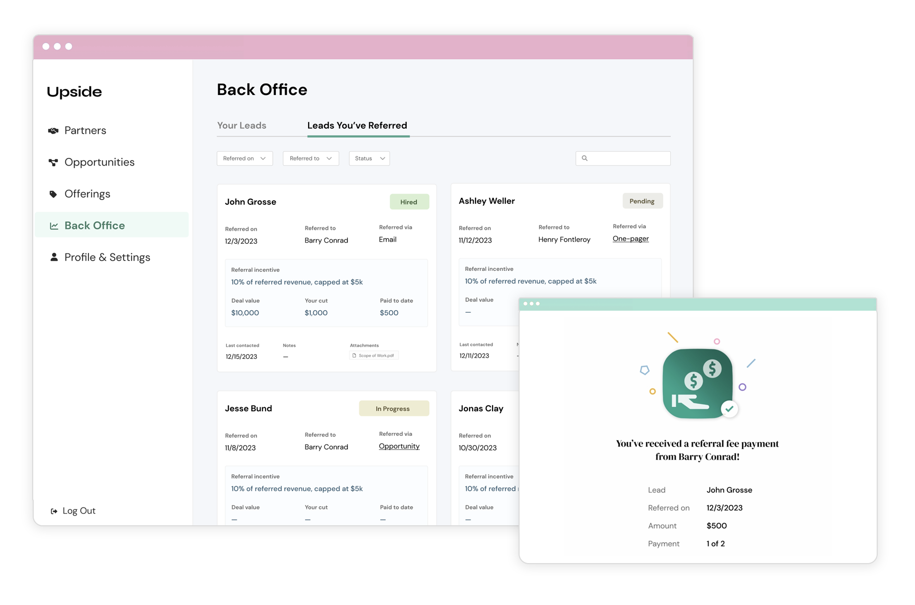 Upside frees you from awkward follow-ups and playing debt collector by handling status updates, feedback, and referral fee payments for every referral you make.